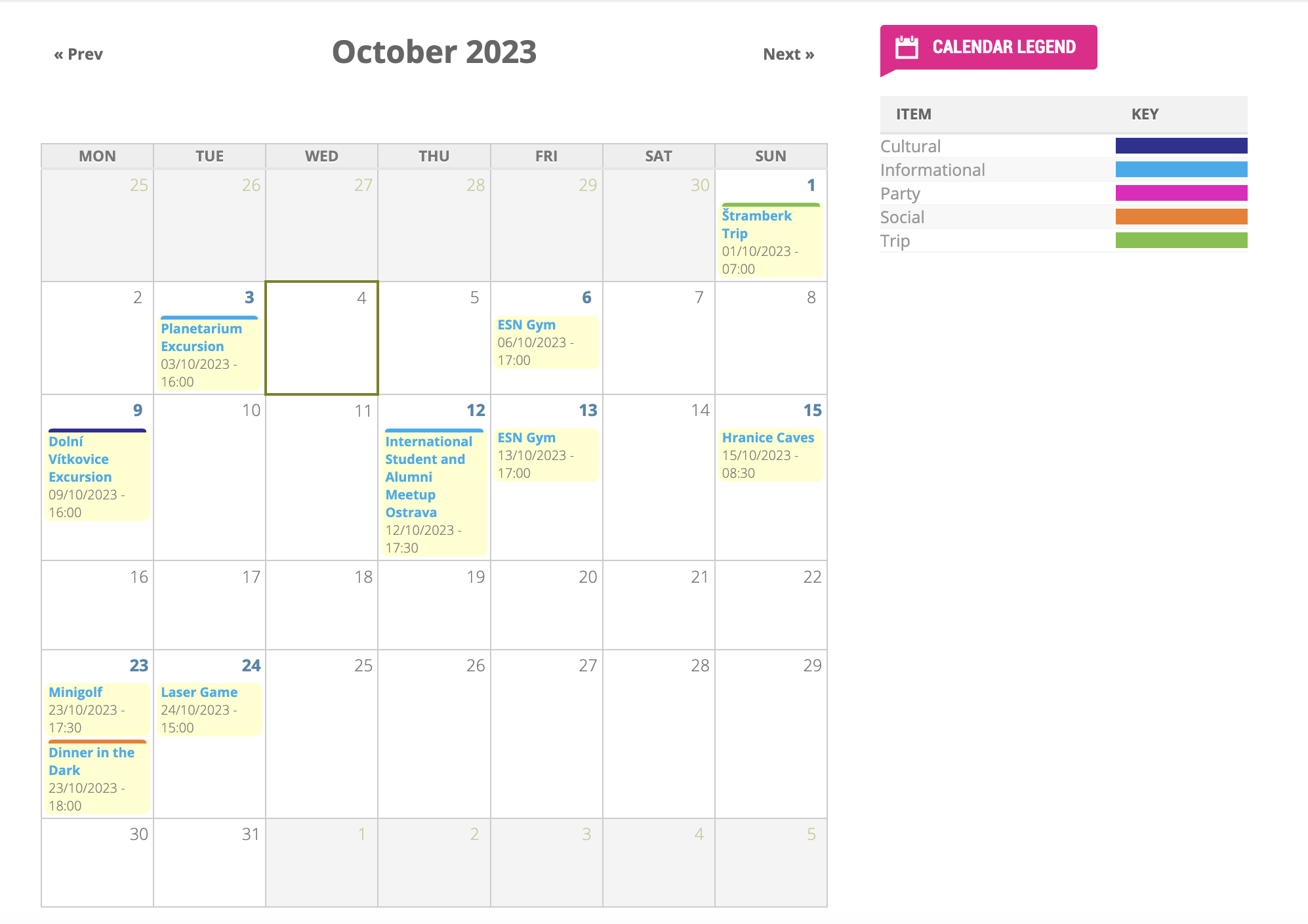 학교 홈페이지에 교환학생 사람들을 위한 스케쥴이 올라와 있다. 날짜가 바뀌기는 하지만, 그래도 ESN에서 운영하는 대략적인 스케줄을 알 수 있어서 좋다. 나같은 경우에는 가고 싶은 이벤트들을 미리 달력에다 표시해두고 여행 스케쥴을 잡았다 :)