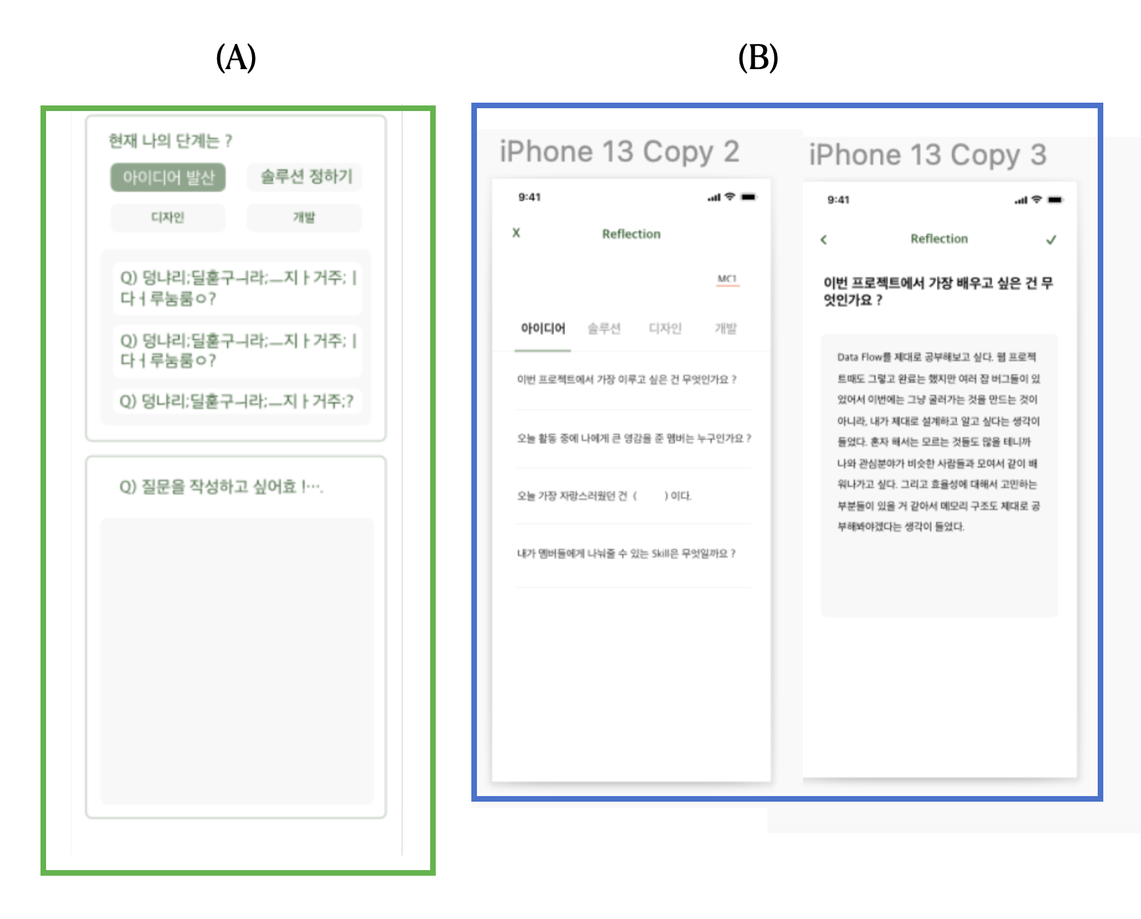 ex) 하단의 (A), (B) 이미지 모두 질문을 선택하고, 질문에 대한 답을 작성하는 View이다.