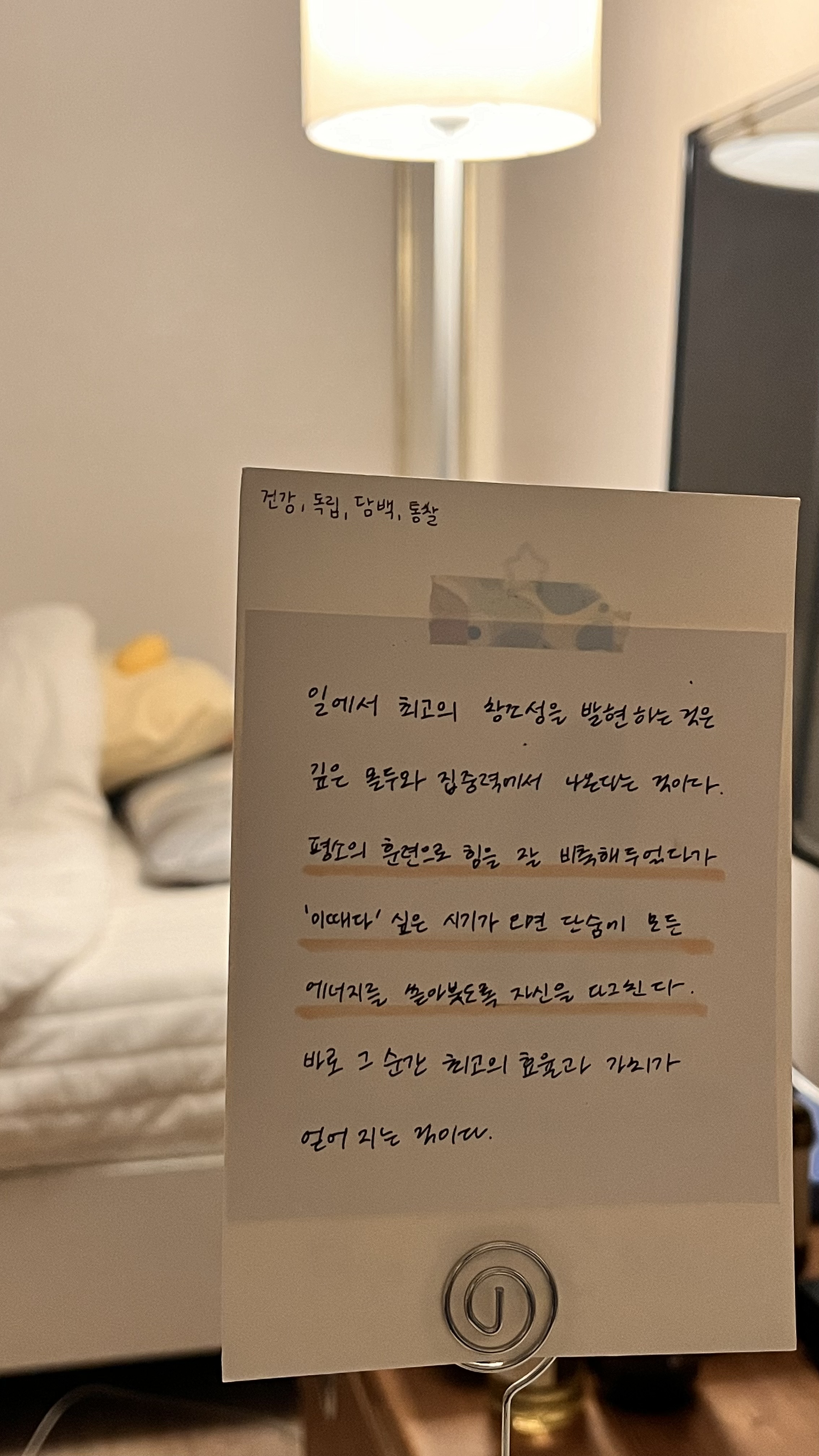 요즘 삶이 살짝 프리랜서 간접 경험의 느낌이 있어서.. 처음으로 모든 것을 내가 결정하고 노력하고 해결하는 과정들이라,,, 조금은 서툴고 어렵고 낯설긴 하지만,, 그래도 이렇게 하나 둘 익히면서 가는 거겠죠..? 아자아자 화이팅!
