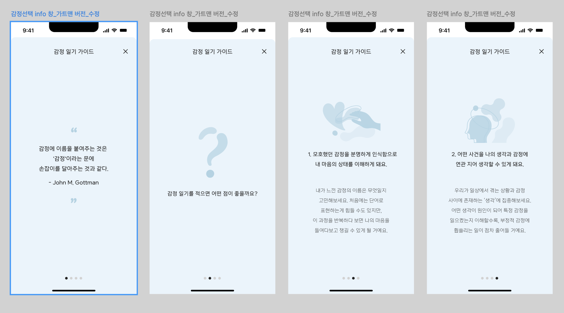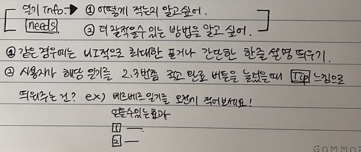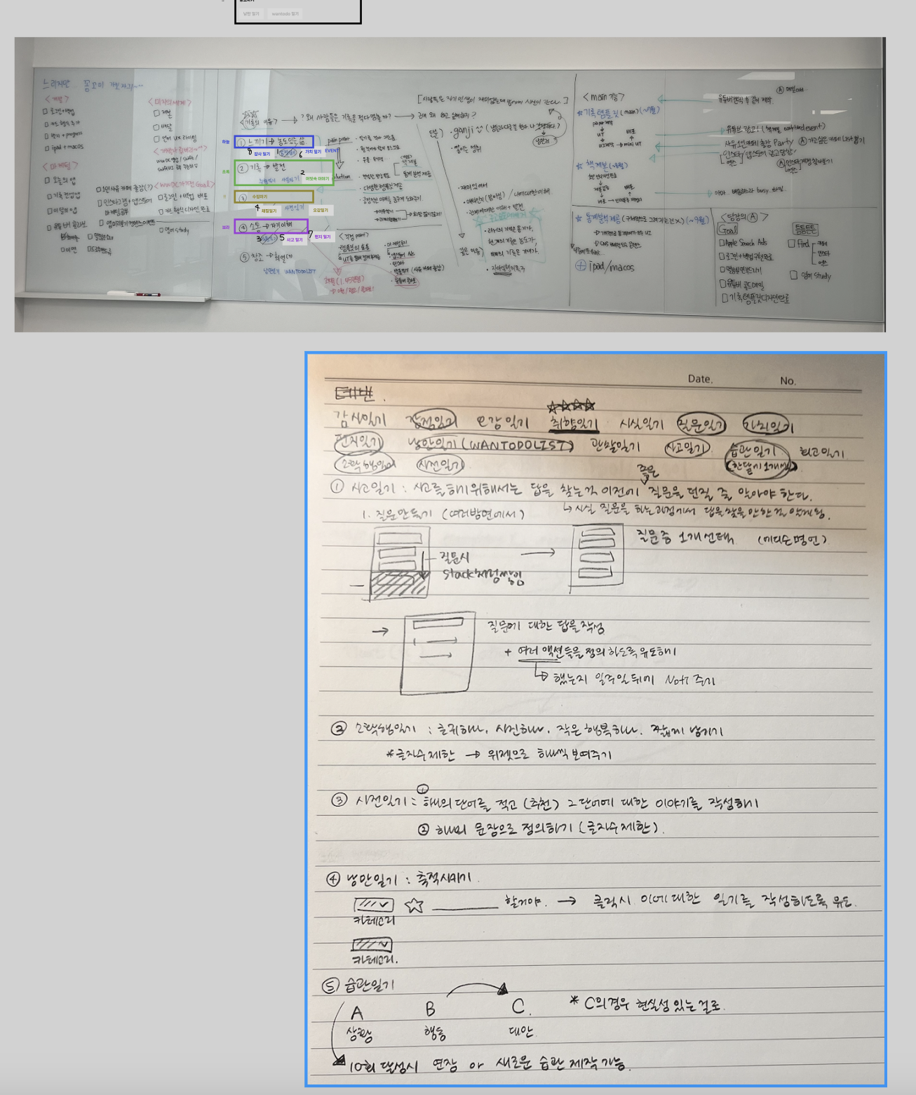 그리고 무엇보다 문제에 접근하는 사람들의 시각들에 대해 배우게 되는 것 같다. 이번에 이야기를 나눴던 분은 배경이 이해가 되어야 문제에 접근하실 수 있는 분이었다. " 이 페르소나는 어떤 사람이에요?, 어느 시점에 일기를 적어요?, 기록을 꾸준히 안 적으면 어떤 상태가 되나요? " 등등의 질문을 받으며 페르소나에 대해 이해할 수 있는 시간이었고, 모호했던 페르소나가 점점 눈코입이 생기며 해상도가 높아지는 경험을 했다.