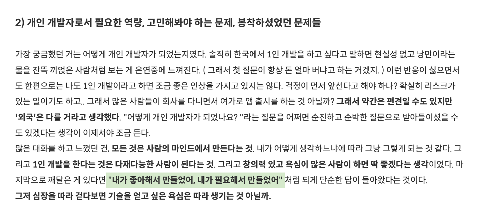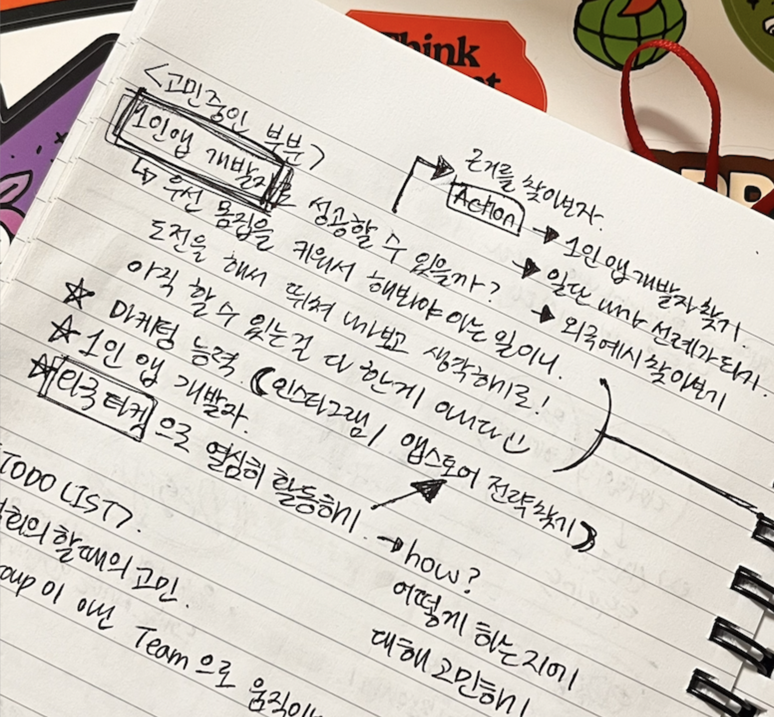 위에 있는 노트 필기처럼 사람들을 찾아다녔고, 컨퍼런스에서 1인 앱 개발을 하는 이들을 만날 수 있었고, 이에 대한 인사이트를 많이 얻을 수 있었다. ( 위 링크 참고 )