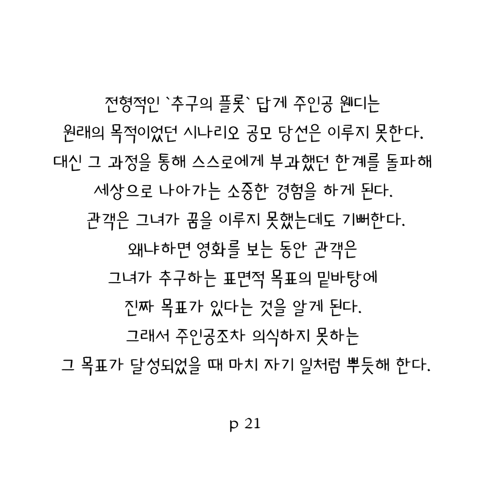 준비하면서 느낀 게 하나가 있다면, <이가은>이라는 사람을 좀 가공시킬 필요가 있다는 것. 인간 이가은 말고, 이런 진중한 자리에서 말을 하고 소통할 때 필요한 새로운 자아가 있다는 것을 느꼈다.  발표 준비하면서 녹음도 하고 영상도 찍고 그랬는데, 그때 느꼈던 게 내 목소리가 신뢰성이 떨어지는 것 같다는 느낌이었다. 그래서 이번에 피칭 준비하면서 목소리를 다듬고 말투를 고치는 연습을 했는데 기분이 되게 이상했다. 원래 쓰던 발성이 아니라 다른 발성법을 사용해서 말하는 방법에 대해 공부했는데, 처음하는 일이라 쉽지 않았던 것 같다. 그래도 결과적으로는 되게 만족하는 발표를 하고 와서 기쁘다.