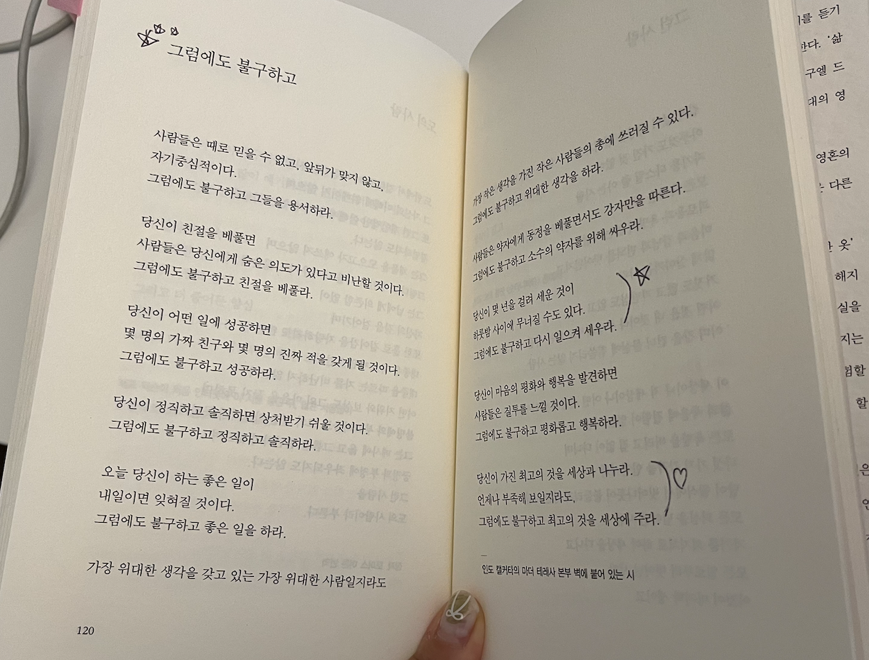 이 시는 너의 삶을 사랑하기 위해 너가 가져야 하는 태도가 "그럼에도 불구하고"라고 이야기하는 것 같아서 괜히 좋았다.