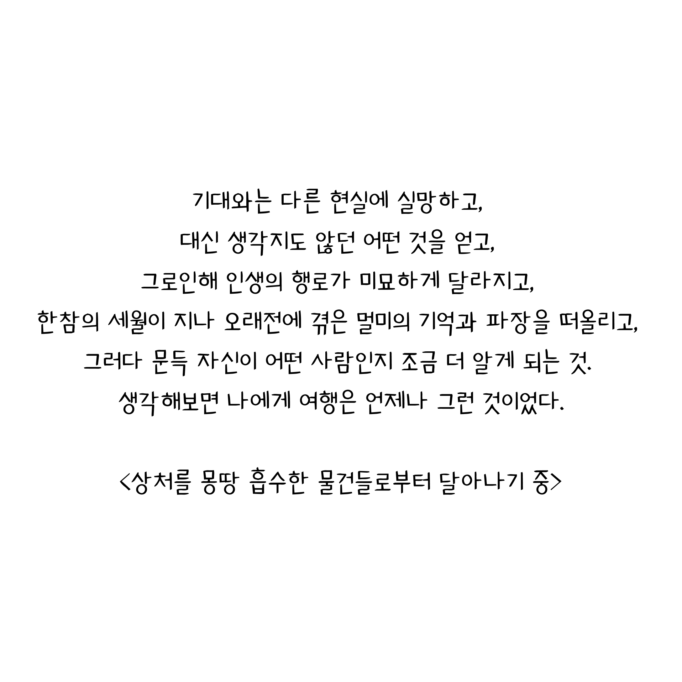 +) 그렇지만 나는 개인적으로 여행이라는 것은 다른 나라를 가고 낯선 경험을 하는 것만을 의미한다고 생각하지 않는다. 새로운 누군가를 만나 그 사람의 사고 방식에 빠져들어 그 사람의 삶을 여행하는 것, 항상 똑같은 사람과 새로운 대화를 해보는 것, 항상 걷던 거리에서 조금 다른 경로로 걸음을 옮겨보는 것, 매일 듣던 노래의 장르가 아닌 새로운 장르의 노래를 들어보는 것... "인생은 하나의 여행이다"라는 말처럼 나는 내가 살아 숨쉬는 모든 순간이 새로운 여행이며 그렇기에 기대되고 긴장되고 걱정되고 설레는 것 같고 그러려고 애를 쓴다.