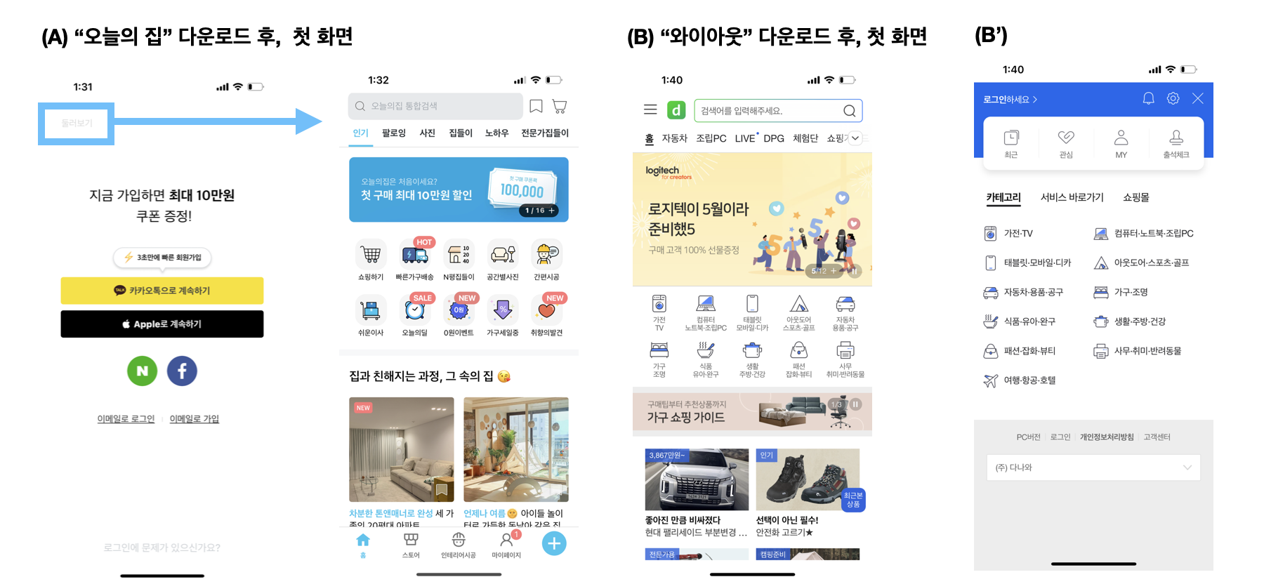 (A)의 경우에는 앱 다운로드 후 앱을 구동했을 때 로그인 즉, setup을 요구한다. 이때, 좌측 상단에 둘러보기를 잘 보이지 않는 컬러로 넣음으로 넛지를 사용했음을 알 수 있다.