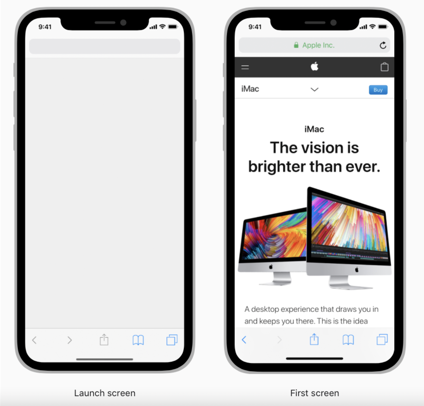 오른쪽의 launch screen은 사용자가 사용할 첫 화면과 비슷하게 안에 컨텐츠들이 채워지기 이전의 화면이 보여진다. 이를 통해 앱이 빠르게 실행되고 있음을 사용자가 인지하게 된다.