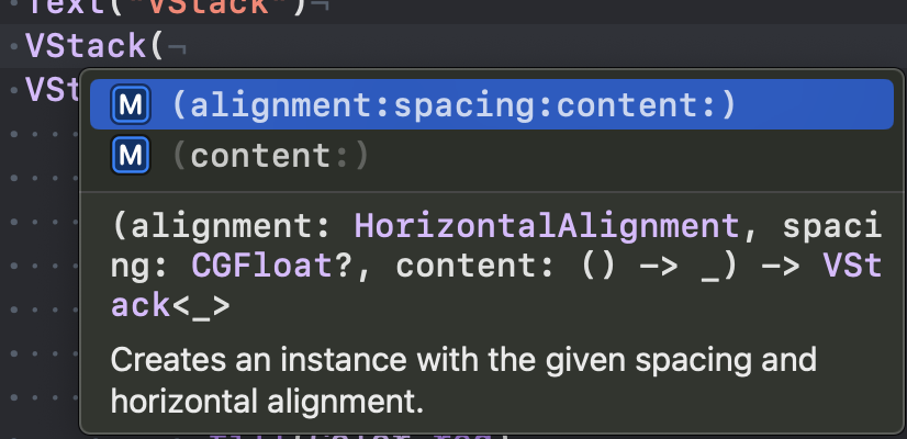 기본값인 aligment: .center, spacing : nil 이 적용된다.