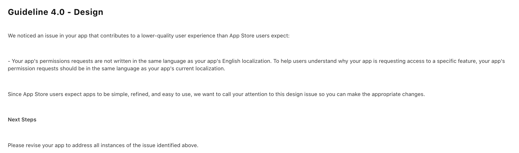 며칠 전 리젝을 먹었다. 앱 추적 alert에 localization이 되어 있지 않다고 해서...